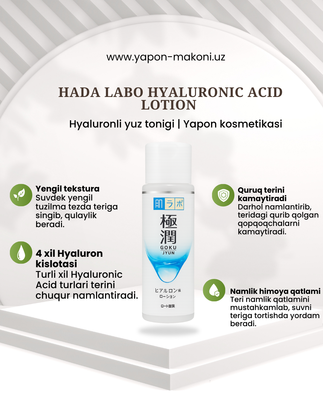 Hada Labo Gokujyun Hyaluronic Acid Lotion – Yaponiyada millionlab sotilgan namlovchi toner bo‘lib, terini intensiv parvarish qiladi.