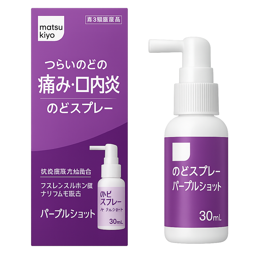 Matsukiyo Purple Shot Plus – Yaponiyada dorixonalarda keng tarqalgan, tomoq va og‘iz bo‘shlig‘i kasalliklariga qarshi maxsus ishlab chiqilgan spreyi. Antibakterial va yallig‘lanishga qarshi ta’sir ko‘rsatib, og‘riqni kamaytiradi va yutishni osonlashtiradi.