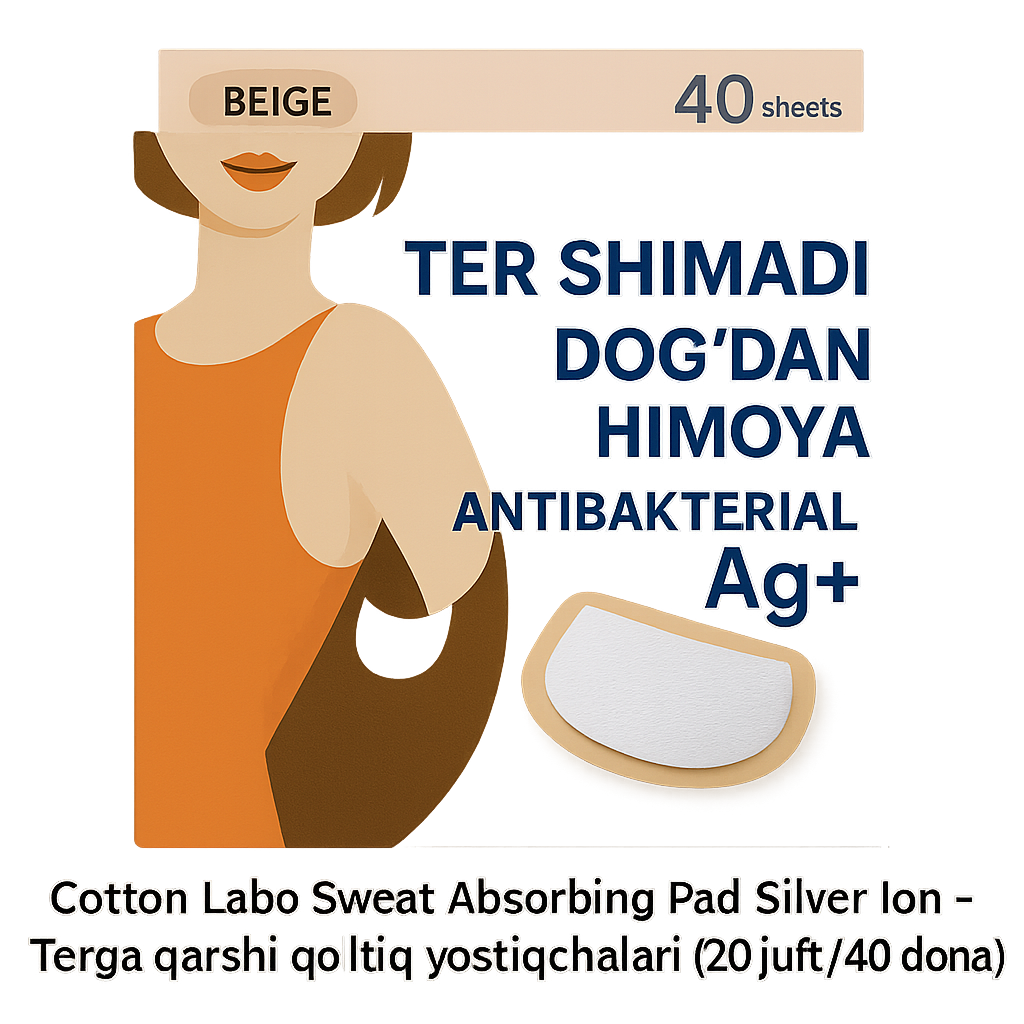 👕 Cotton Labo Sweat Absorbing Pad – kiyim ostiga yopishtiriladigan ter yostiqchalari. Terini tez shimib oladi, kiyimda dog‘ qoldirmaydi va kun bo‘yi tozalikni ta’minlaydi. Silver ion (Ag+) texnologiyasi antibakterial himoya beradi.